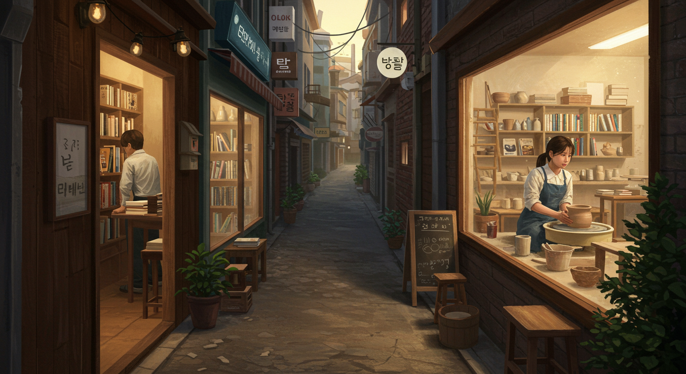 "너무 의식하지 마. 평소대로 해." 지훈이 조언했지만, 민호는 쉽게 긴장을 풀 수 없었다. 특히 맞은편 공방에서 수아가 이쪽을 보고 있다는 생각이 들면 더욱 어색했다.